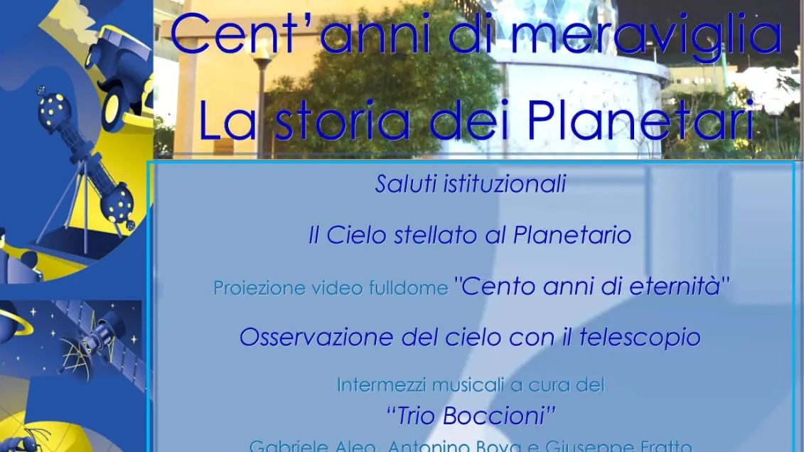 Mercoledì 7 maggio 2025, a partire dalle ore 21:00, l’iniziativa dal titolo “Cent’anni di meraviglia: la storia dei Planetari” si aprirà con i saluti istituzionali per poi proseguire con una visita guidata sotto la cupola del planetario, proiezione spettacolo fulldome “100 anni di eternità” di 35 minuti, realizzato da Tobias Wiethoff e dal planetario di Bochum per conto di GdP (Associazione dei Planetari di Lingua Tedesca) e osservazione del cielo con gli strumenti. La serata sarà allietata da intermezzi musicali curati dal “Trio Boccioni” Gabriele Aleo, Antonino Bova e Giuseppe Fratto.