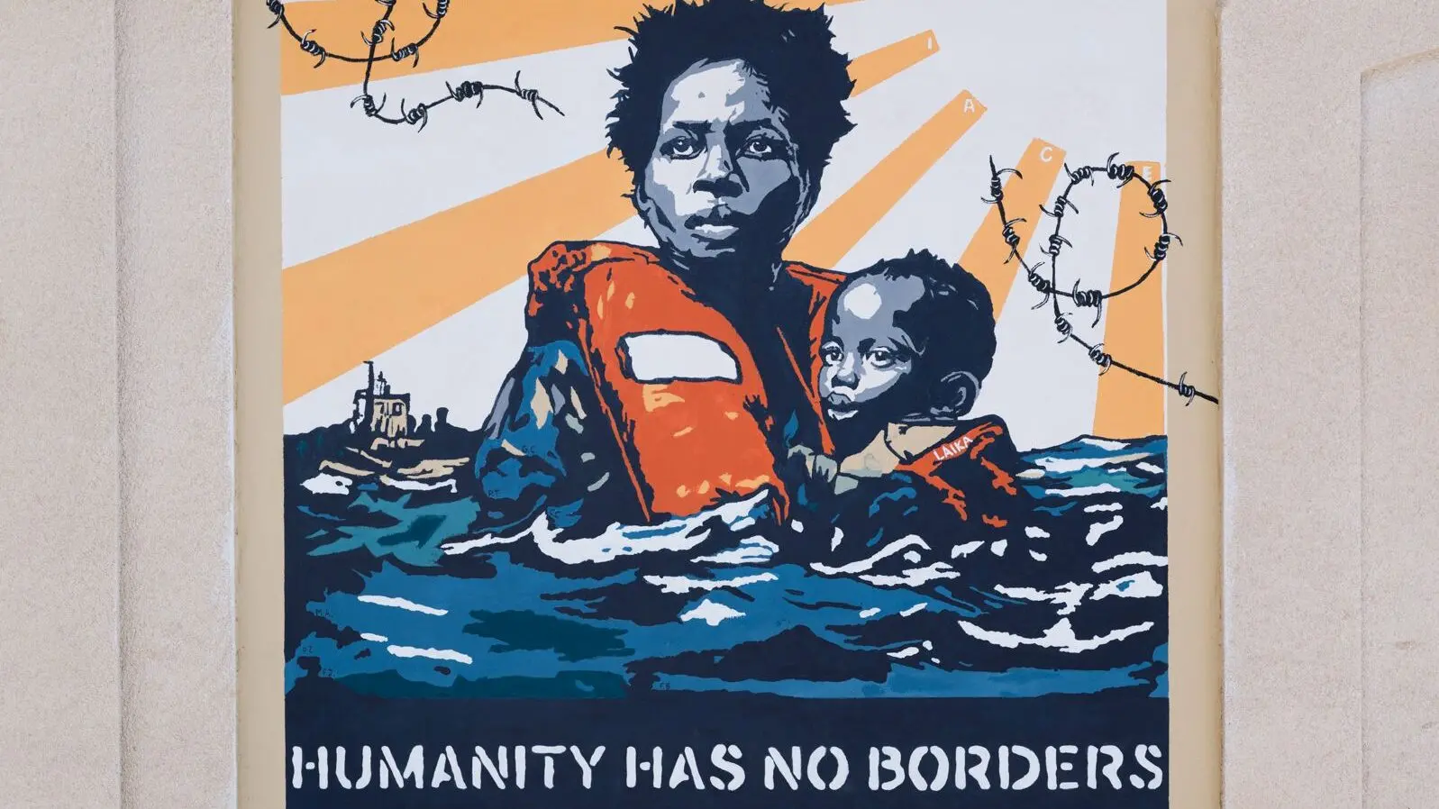 È stato inaugurato ieri sera a Riace un nuovo murale dell’artista e attivista italiana Laika, a sostegno del modello di accoglienza che ha reso il borgo calabrese un simbolo internazionale di solidarietà. L’opera raffigura una madre con un bambino in mare, entrambi con giubbotti di salvataggio, avvolti da filo spinato spezzato. Sullo sfondo, il messaggio che attraversa l’intero murales: “Humanity has no borders” (tr.: “L’umanità non ha confini”).