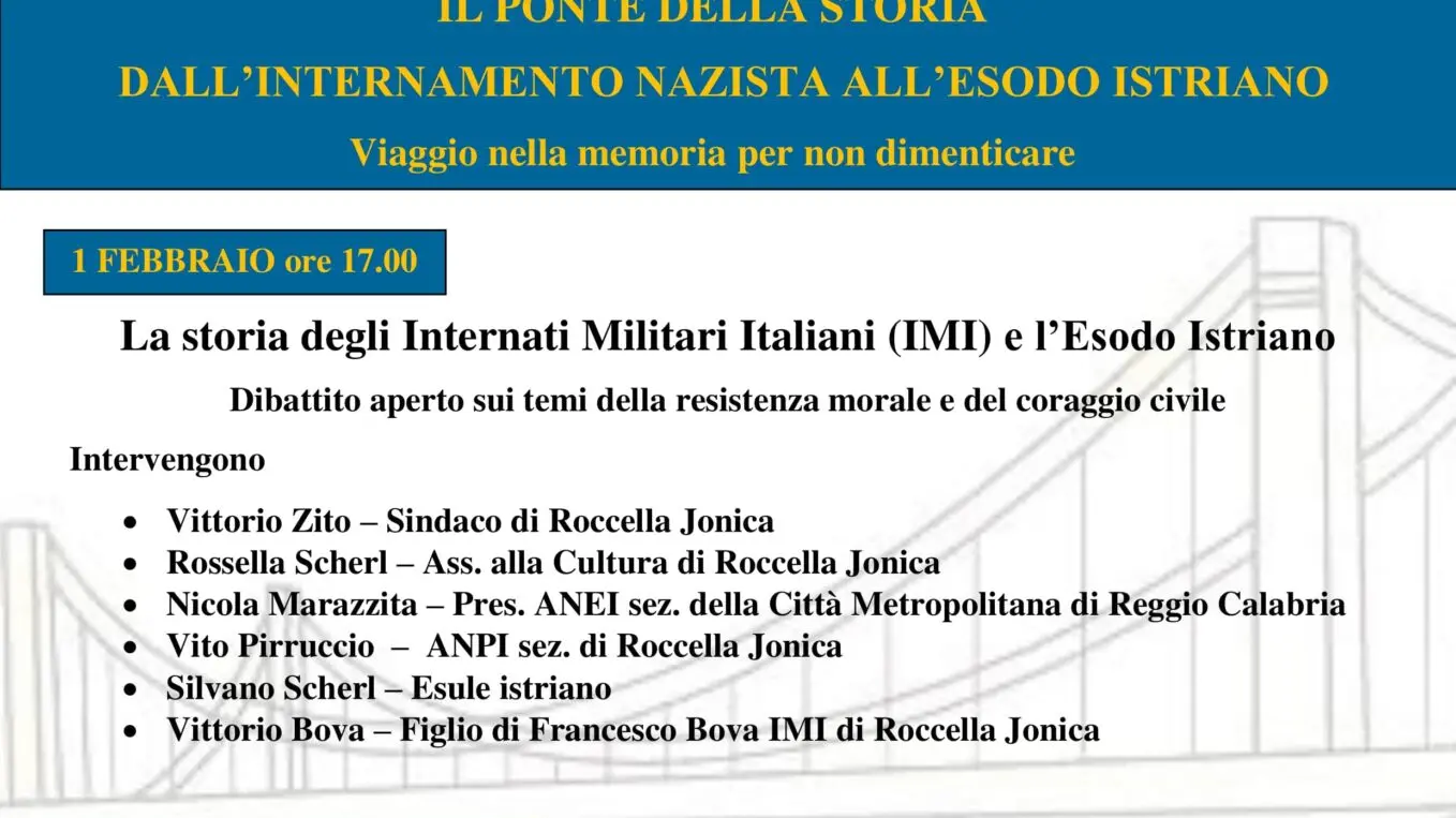 In questo difficile momento storico, è più che mai fondamentale che le giornate celebrative non rischino di diventare divisive, ma siano occasione di dialogo e riflessione collettiva. A tal fine, l’Amministrazione comunale di Roccella Jonica, assieme alla sezione locale dell’ANPI (Associazione Nazionale Partigiani Italiani) e di ANEI (Associazione Nazionale Ex Internati), ha pensato ad un evento, articolato in due date, che unisca la memoria al ricordo, dedicato alla storia degli internati militari italiani a quella degli esuli istriani, fiumani e dalmati. Si tratta del progetto “Memorie condivise. Il ponte della Storia – Dall’internamento nazista all’esodo istriano” in programma l’1 e il 4 febbraio a Roccella e Caulonia.