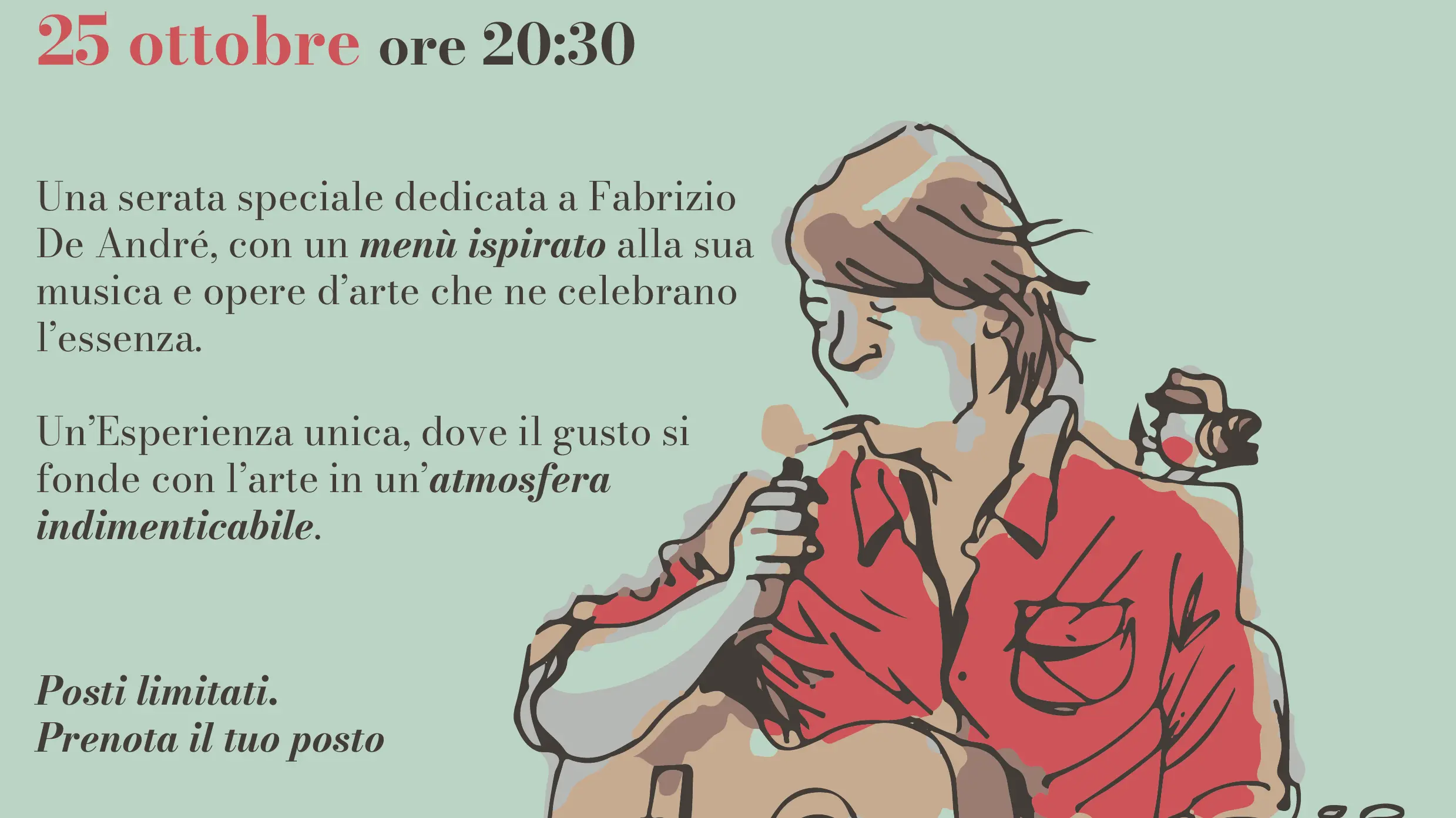 Ad arricchire ulteriormente l’atmosfera, infatti, durante la serata saranno esposte le opere del Maestro Maurizio Carnevali, che con il suo stile unico reinterpreta l’universo poetico di De André attraverso l’arte visiva.