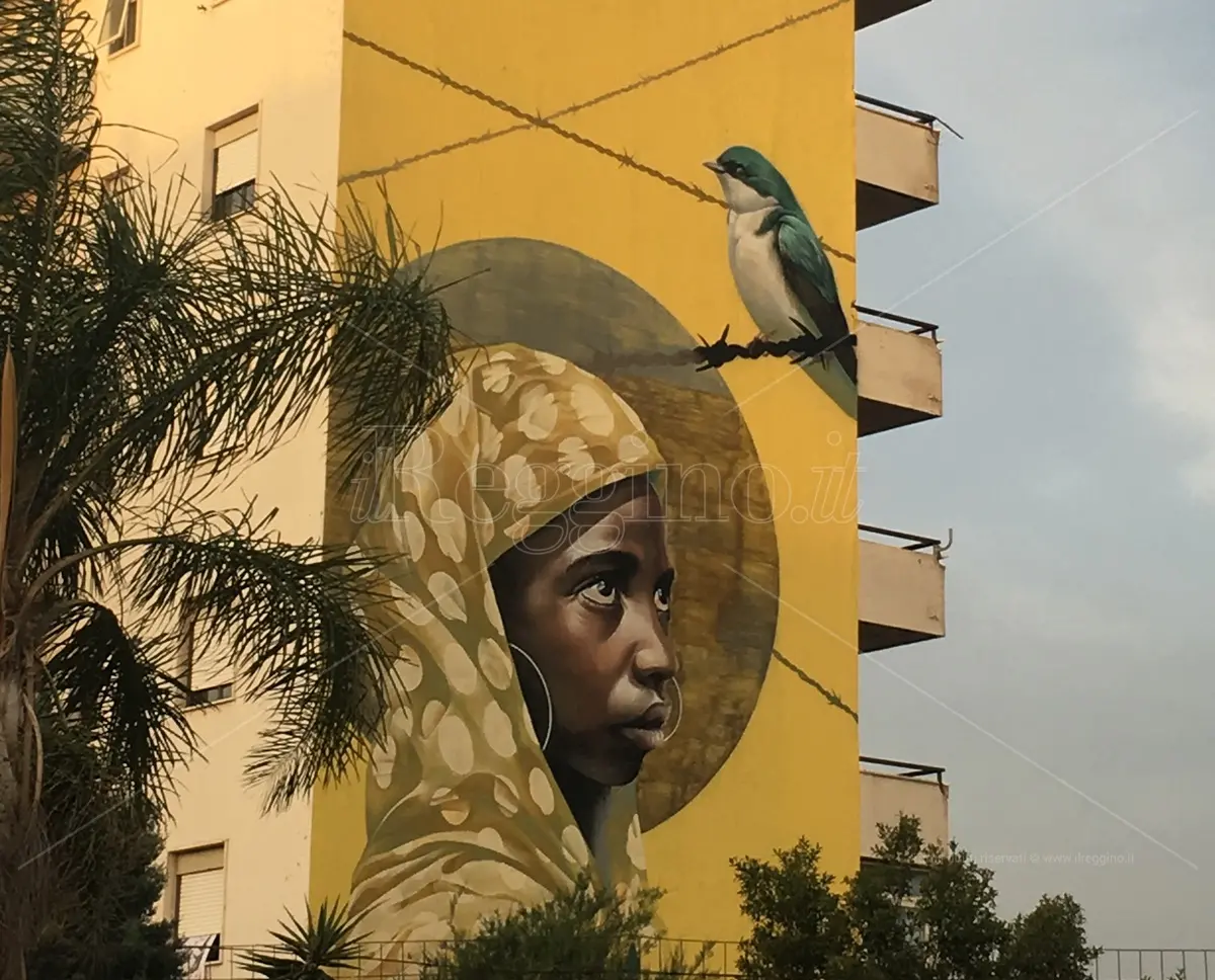 La prima fu realizzata nel 2015 nell’ambito della Giornata Mondiale contro il Razzismo da Giulio Rosk Gebbia con Mirko Loste Cavallotto proprio ad Arghillà sud, periferia nord di Reggio Calabria. Una donna migrante che accoglie e raccoglie speranze si staglia ancora luminosa su quella zona collinare tutta da riscattare. Gli altri due sono stati realizzati a Ponticelli nel napoletano e a Trieste.