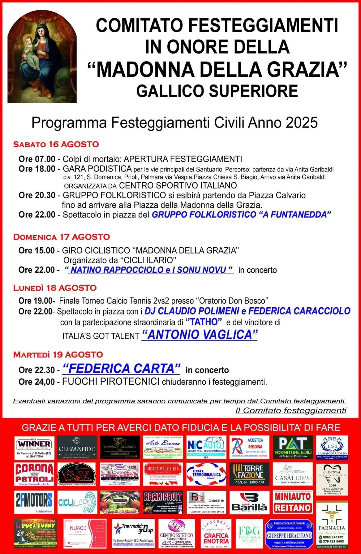 La festa, che comprende un ricco programma di appuntamenti religiosi e civili, rappresenta uno dei momenti più simbolici di aggregazione della città e, in particolare, il massimo momento per la comunità della vallata di Gallico, riunita per celebrare la sua santa Patrona: Maria SS. Della Grazia.