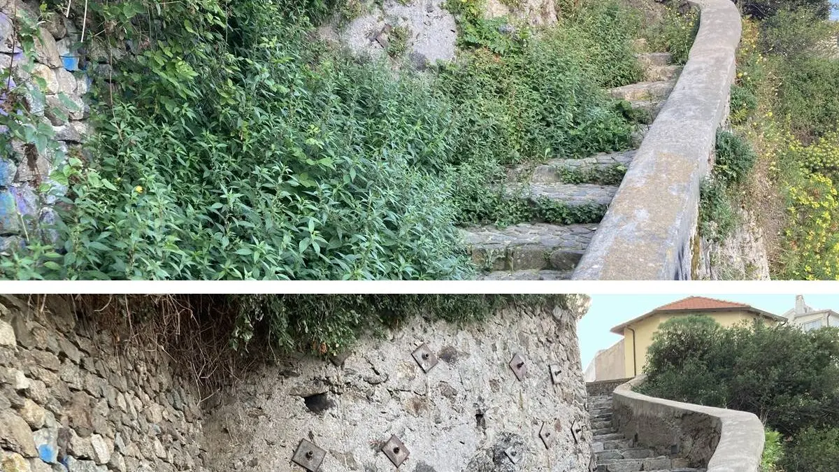 All’inizio dell’intervento, la Scalinata Giuseppe Garibaldi era invasa da sterpaglie, rovi, calcinacci e immondizia. Dopo una bonifica approfondita, sono stati piantati oltre 20 esemplari tra alberi e arbusti, tra cui olivi, agavi, bougainvillea, lavanda, fico d’India, palma nana, cipresso, lantane e rosmarino. Un giovane artigiano locale ha ricostruito un muretto a secco, contribuendo alla rinaturalizzazione del luogo.