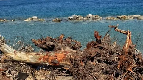 Il tratto compreso tra il torrente Santa Trada e il torrente Piria appare ormai compromesso. La piccola barriera posizionata dopo il Santa Trada è affondata, mentre l’erosione avanza con effetti visibili: crollano strutture, cedono alberi, la linea di costa arretra.