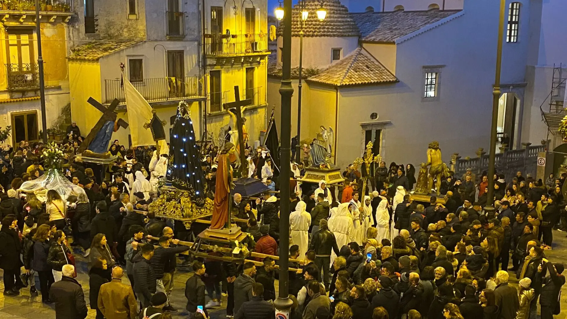Dopo 3 anni di stop forzato è tornata a Caulonia la tradizionale processione del Caracolo, il momento clou di tutta la Settimana Santa nel piccolo borgo della Locride. Il rito che si celebra da secoli ogni sabato santo affonda le sue radici nella dominazione spagnola. Otto le statue portate in processione per le vie del paese, raffiguranti i momenti più significativi della Passione di Cristo. Il rito ha inizio quando le due arciconfraternite cittadine (del Rosario e dell’Immacolata), in passato rivali, con i propri confratelli vestiti di saio bianco e incappucciati con una corona di spine sul capo, si incontrano nel punto centrale del paese.