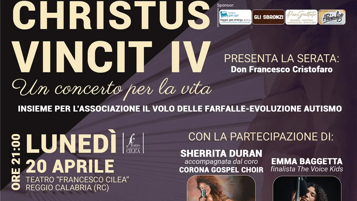 con grande piacere vi invitiamo a partecipare e a seguire l’evento “Christus Vincit IV – Un Concerto per la Vita” che si terrà lunedì 20 aprile 2026, alle ore 21 presso il Teatro Francesco Cilea di Reggio Calabria.