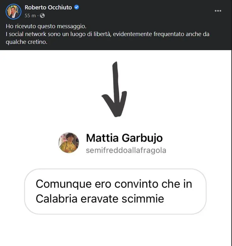 Questa volta è un tale – Mattia Garbujo – a mettere nella piazza virtuale del presidente Occhiuto tutta la sua brillante originalità, mostrando il proprio quoziente intellettivo con un semplice: «Comunque ero convinto che in Calabria eravate scimmie».