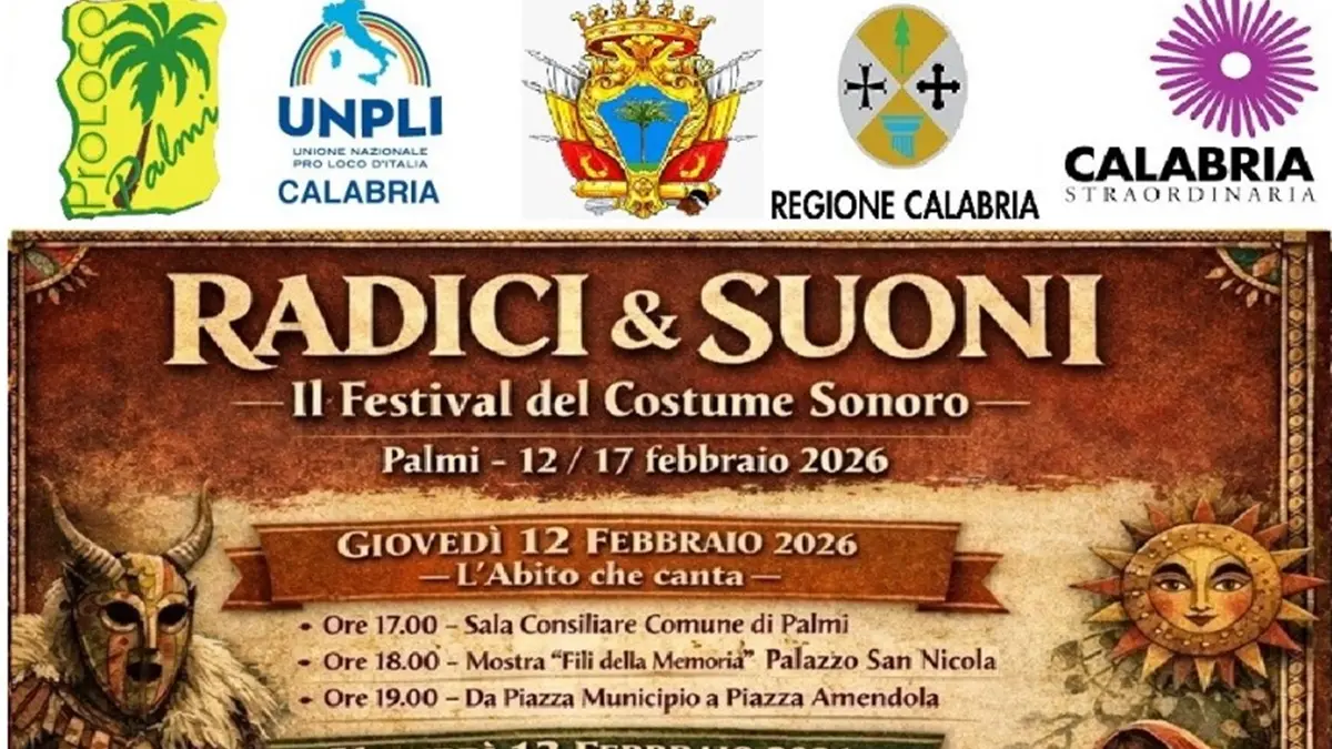 La Pro Loco di Palmi, in collaborazione con Unpli Calabria, con il patrocinio del Comune di Palmi, della Regione Calabria e nell’ambito del brand Calabria Straordinaria, presenta “Radici & Suoni – Il Festival del Costume Sonoro”, in programma a Palmi dal 12 al 17 febbraio 2026.