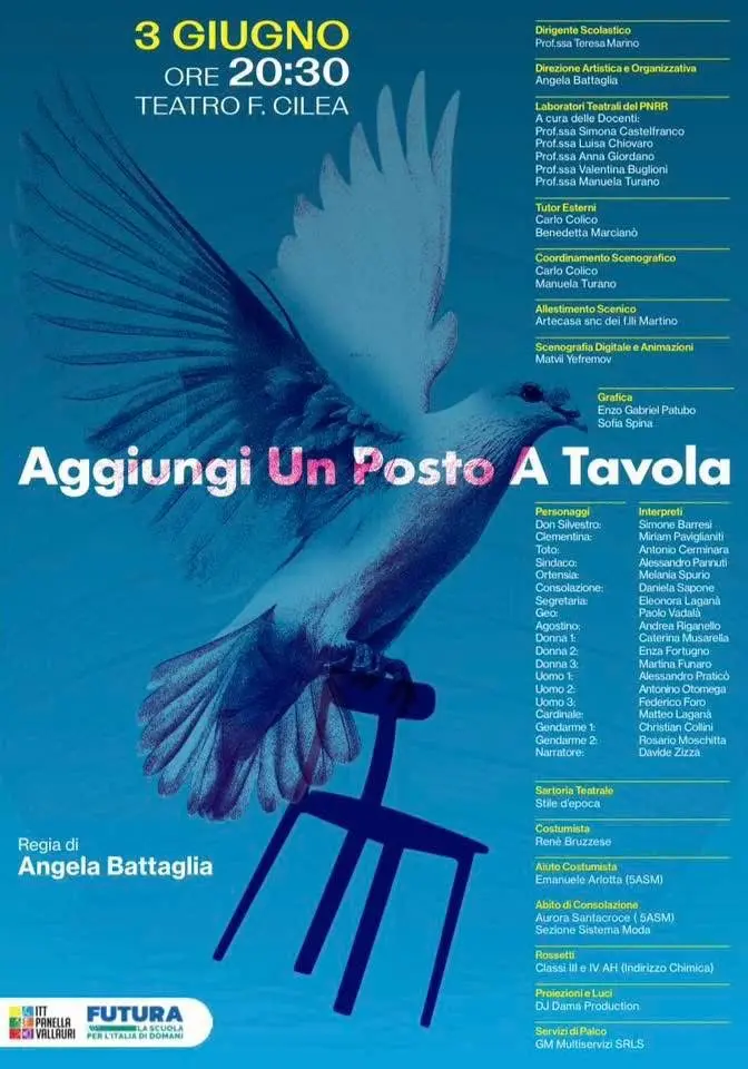 Non serve frequentare un percorso di studi prettamente artistico per imparare a dare forma alle emozioni. A volte basta una professoressa che entra in classe e domanda: «Chi vuole fare teatro?». Così è cominciato, tra esitazioni e slanci improvvisi, il viaggio teatrale degli studenti dell’Istituto tecnico industriale Panella Vallauri di Reggio Calabria, culminato la sera del 3 giugno sul palco del Teatro Cilea con lo spettacolo “Aggiungi un posto a tavola”, a conclusione delle attività del progetto intitolato “Nessuno Escluso Mai”, nell’ambito del Progetto PNRR Missione 4: Intervento straordinario finalizzato alla riduzione dei divari territoriali nelle scuole secondarie di primo e secondo grado e alla lotta alla dispersione scolastica.