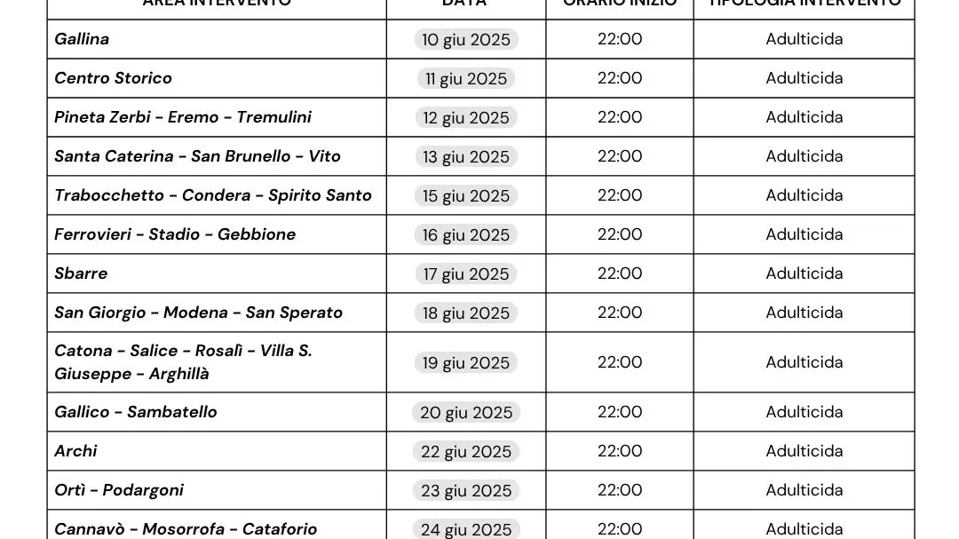 Il Comune di Reggio Calabria, in collaborazione con Ecologia Oggi, ha programmato un ciclo di interventi di disinfestazione adulticida per il mese di giugno 2025, con l’obiettivo di contenere la presenza di insetti molesti su tutto il territorio comunale.