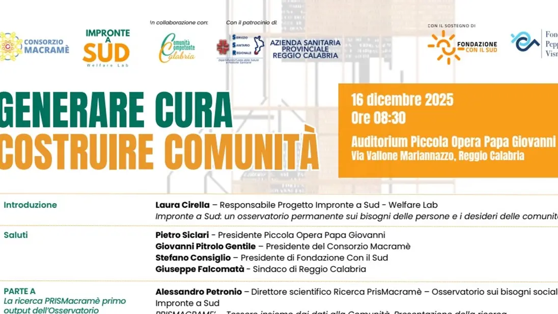 La seconda giornata, ospitata presso la Piccola Opera Papa Giovanni, con il patrocinio dell’Asp di Reggio Calabria e in collaborazione con Comunità Competente, restituisce gli esiti della ricerca PrisMacramè, primo output dell’Osservatorio Impronte a Sud e frutto del lavoro del Laboratorio di ricerca sociale del progetto. La ricerca ha analizzato i bisogni di 232 utenti in carico all’Assistenza domiciliare socio-sanitaria, contribuendo a delineare un nuovo modello sperimentale di mutualità territoriale e una visione rinnovata della cura come processo comunitario.