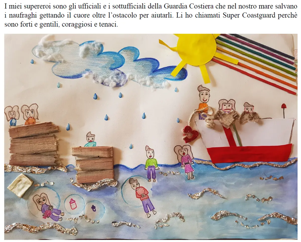 L’occasione è stata offerta dal recente concorso indetto dalla Regione Calabria con il tema “Eroi e Supereroi”, che ha visto classificarsi al 3° posto il disegno della giovane studentessa, arricchito da parole che ben testimoniano quanto l’impegno della Guardia Costiera faccia breccia nell’immaginario dei più piccoli: “Li ho chiamati Super Coastguard perché sono forti e gentili, coraggiosi e tenaci”.