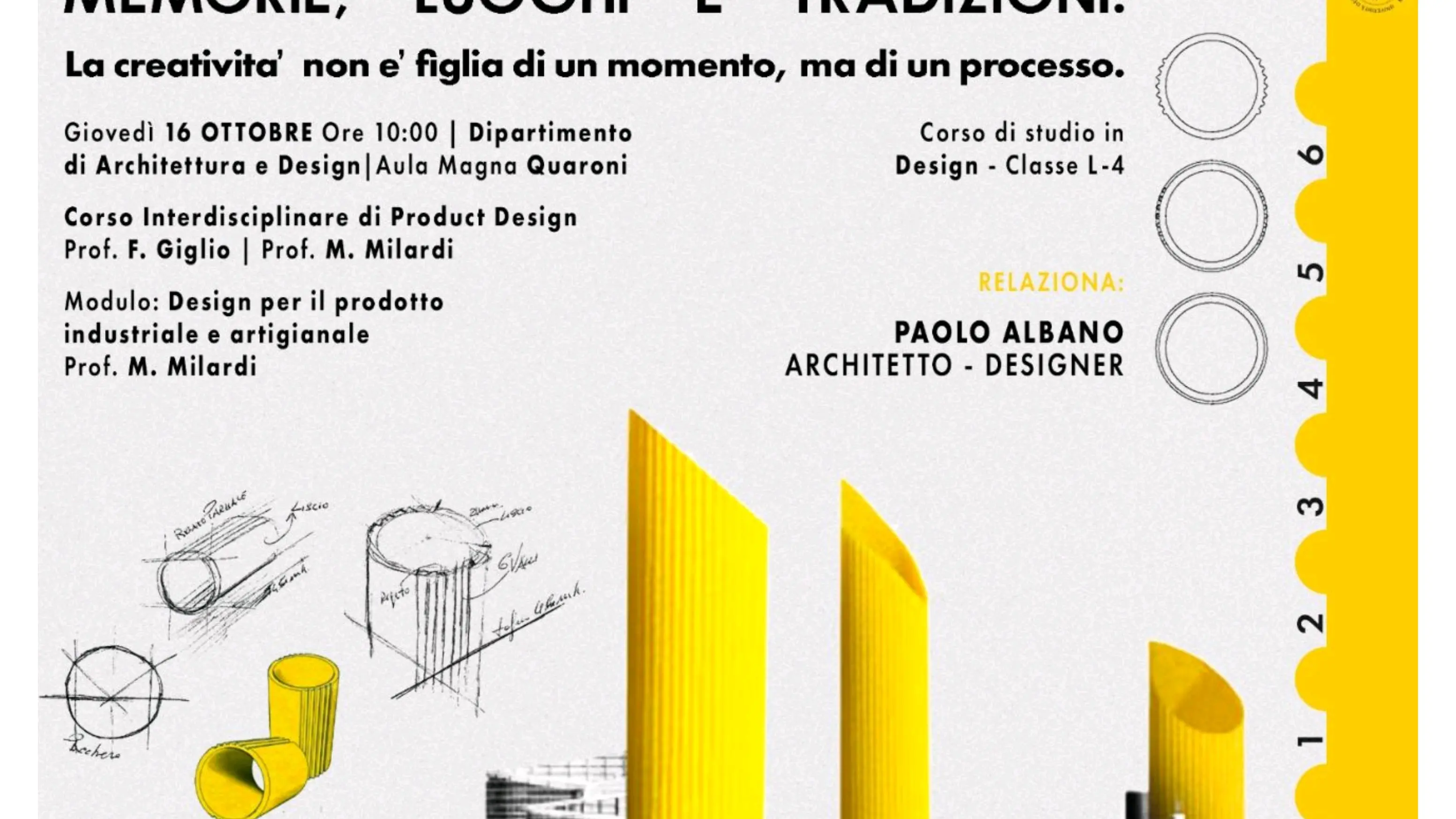Presenti al convegno anche il prof. Martino Milardi, che ha organizzato il tutto, e la prof.ssa Francesca Giglio. Entrambi hanno illustrato il corso di design alle matricole, in particolare il «Corso interdisciplinare di Product Design» e il modulo «Design per il prodotto industriale e artigianale», tenendo presente, nei loro interventi, la centralità del discorso di Albano: «la creatività non è figlia di un momento, ma di un processo».