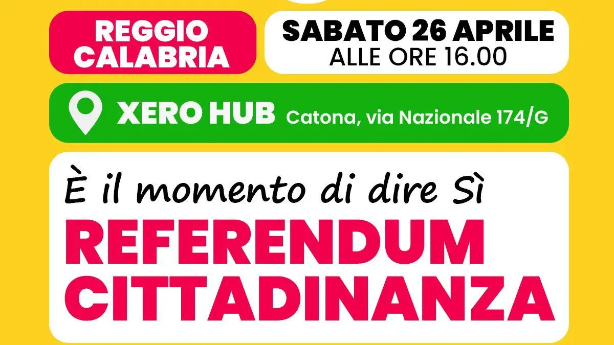 Il Coordinamento cittadino di Più Europa organizza, per sabato 26 aprile alle ore 16:00, un’importante iniziativa pubblica a sostegno del Sì al referendum sulla cittadinanza. L’evento si terrà a Reggio Calabria presso lo Xero Hub di Catona sito in Via Nazionale 174/G e vedrà la partecipazione di esponenti politici, rappresentanti di associazioni e movimenti della società civile, uniti dalla volontà di promuovere una cittadinanza più giusta e inclusiva.