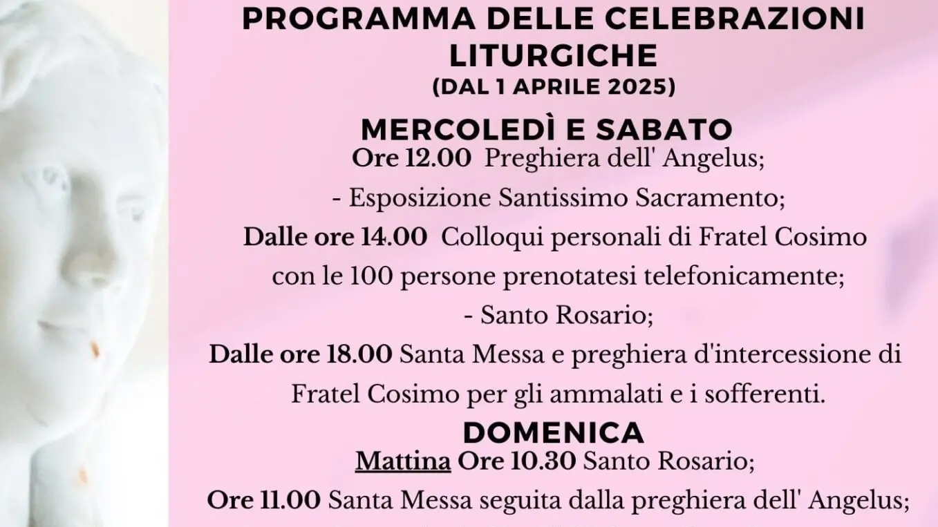 Dal martedì primo aprile variano gli orari delle attività liturgiche presso il santuario della Vergine Immacolata Nostra Signora dello Scoglio, fondato da Fratel Cosimo, oltre mezzo secolo fa. Al rinomato santuario giubilare si può lucrare l’indulgenza plenaria. A riguardo, ha espresso il coordinatore generale e portavoce, dott. Giuseppe Cavallo, «L’indulgenza plenaria si può lucrare se veramente pentiti e mossi da spirito di carità. Dopo avere visitato il nostro santuario giubilare e varcato la porta santa» – ha continuato – «bisogna: confessarsi, partecipare alla Santa Messa recitando il Credo, ricevere la comunione e pregare secondo le intenzioni del Sommo Pontefice, con un pater, ave e gloria». E’ stato inoltre annunciato che sabato dodici aprile sarà il vescovo della diocesi di Locri – Gerace, monsignor Francesco Oliva a presiedere una solenne concelebrazione eucaristica a guidare la processione e a benedire le palme. L’inizio delle funzioni è previsto per le ore 14:30.