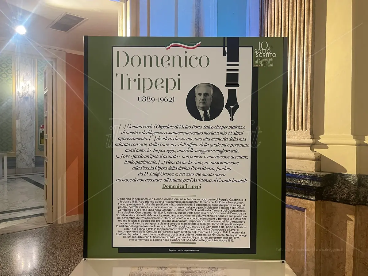 Domenico Tripepi (Reggio Calabria, 14 febbraio 1889 – 26 ottobre 1962) è stato un avvocato e politico. Nel suo testamento: “Nomino erede l’Ospedale di Melito Porto Salvo che per indirizzo di onestà e di diligenza costantemente tenuto merita il mio e l’altrui apprezzamento. (…) desidero che sia intestata alla memoria della mia adorata consorte, dalla cortesia e dall’affetto della quale mi è pervenuto quasi tutto ciò che posseggo, una delle maggiori e migliori sale.[…] è necessario che io precisi che ove- faccio un’ipotesi assurda- non potesse o non dovesse accettare, il mio patrimonio, defalcato dai legati, viene da me lasciato, in sua sostituzione, alla Piccola Opera della divina Provvidenza, fondata da D. Luigi Orione, e , nel caso che questa opera ritenesse di non accettare, all’Istituto per l’Assistenza ai Grandi Invalidi.