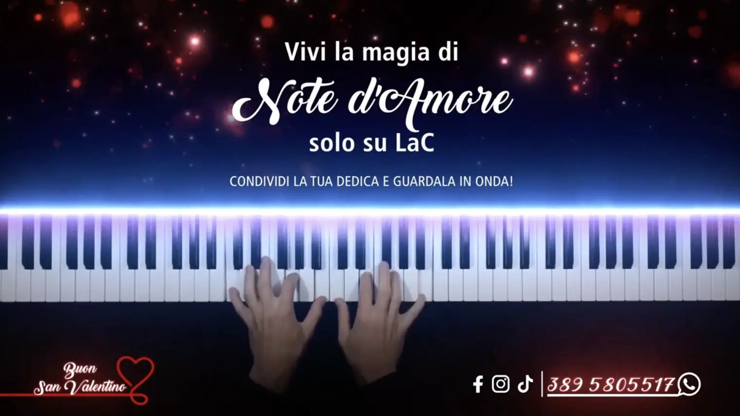 È l’inizio di un invito irresistibile: «Vivi la magia di Note d’Amore solo su LaC. Condividi la tua dedica e goditi lo spettacolo in onda! Invia la tua dedica al numero WhatsApp 389 5805517».