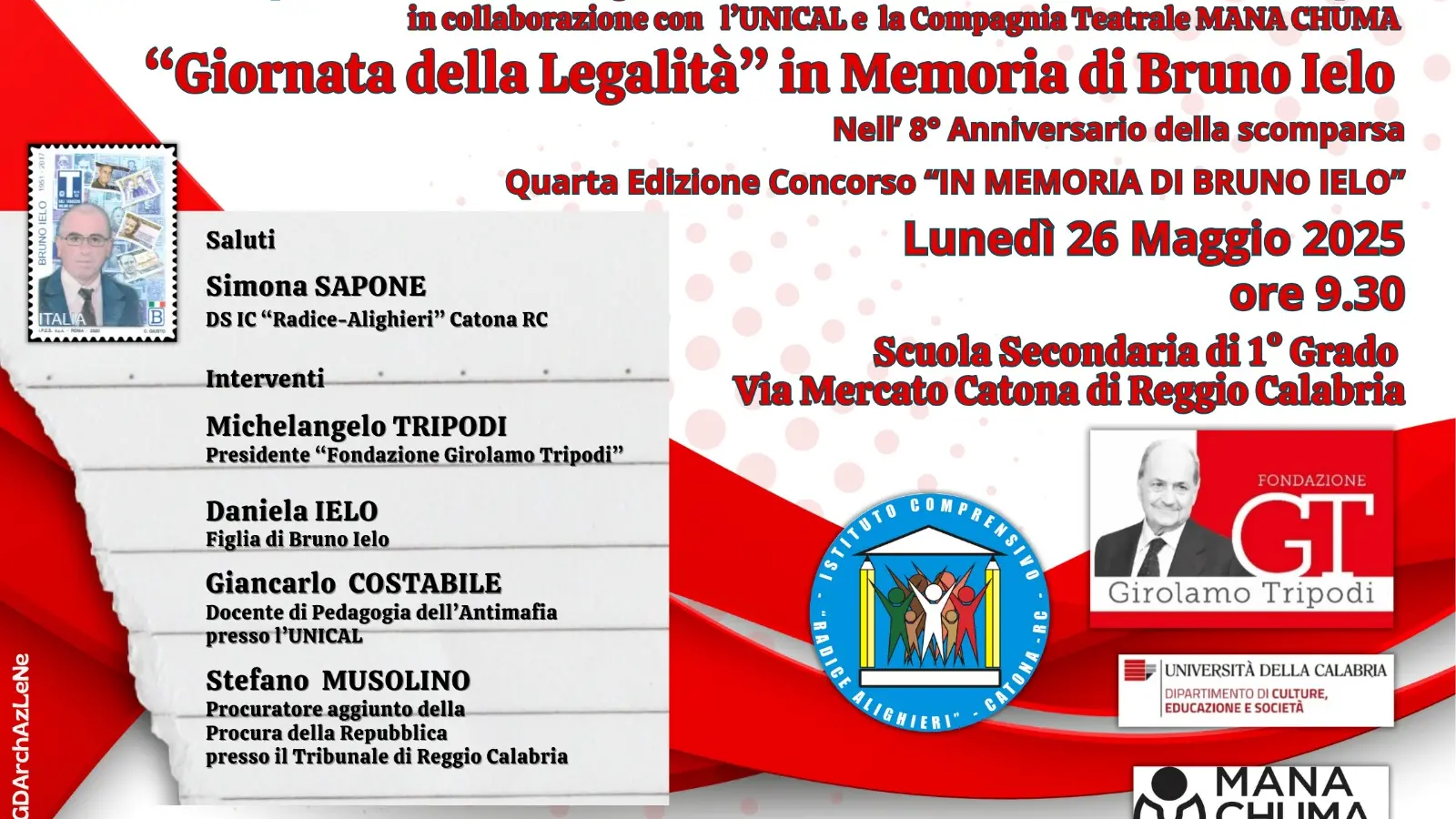 L’evento si svolgerà il 26 maggio c.a. alle ore 9:30 presso la Scuola Secondaria di 1° Grado di Via Mercato a Catona (ex CIAPI) e vedrà la partecipazione di Simona Sapone, Dirigente scolastica, che introdurrà i lavori; di Michelangelo Tripodi, Presidente della Fondazione Girolamo Tripodi; di Daniela, figlia di Bruno Ielo; di Giancarlo Castabile, Docente UNICAL di Pedagogia dell’Antimafia e di Stefano Musolino, Procuratore Aggiunto della Procura della Repubblica presso il Tribunale di Reggio Calabria.