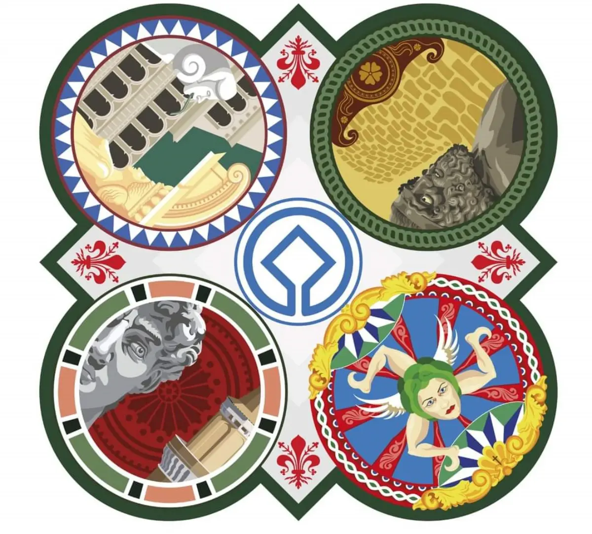 Al centro della grande opera emerge il simbolo dell’Unesco, mentre il giglio fiorentino si ripete ai vertici del quadrato. I quattro cerchi che compongono la geometria, invece, racchiudono in sé elementi artistici di una o più regioni. La prima circonferenza è dedicata alla Toscana e alle Marche, riprendendo l’audace volto del David di Michelangelo, il rosone gotico del meraviglioso duomo di Santa Maria del Fiore e una delle torri del palazzo ducale di Urbino, racchiuso dai tipici decori geometrici del gotico toscano. La seconda circonferenza è dedicata al Lazio, col Colosseo romano, e i particolari della villa d’Este di Tivoli e la fontana di San Sebastiano di Genzano, incorniciati da un ornamento di tipo geometrico, ispirato ai decori nei mosaici delle domus romane.