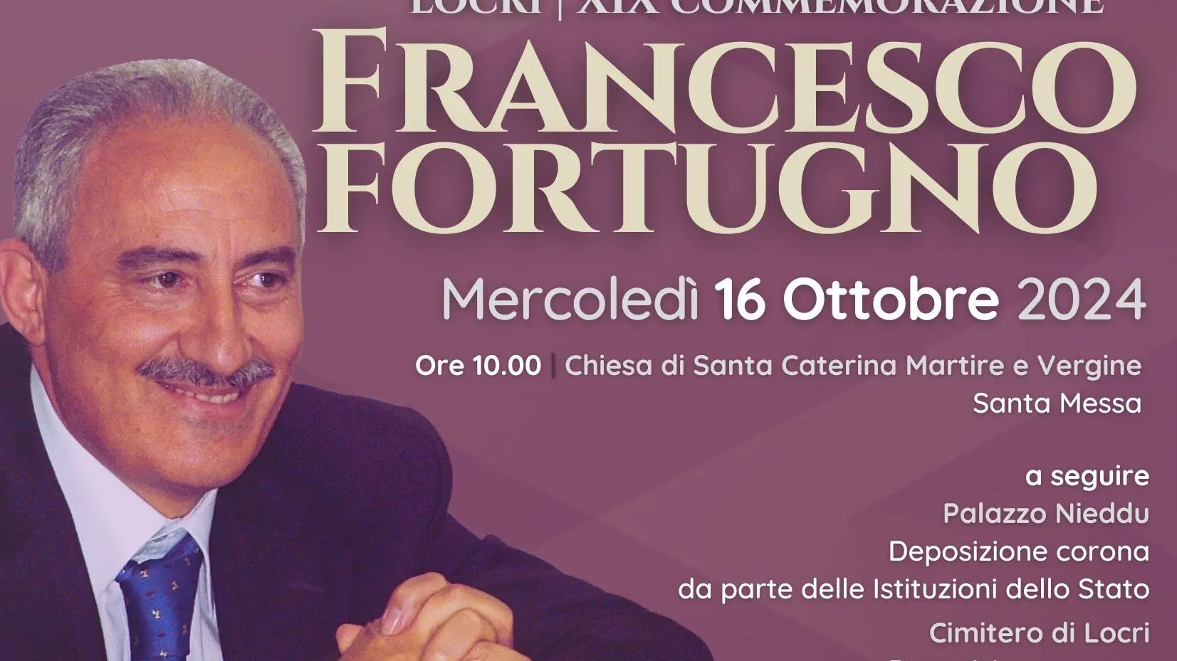 Il programma prevede, alle ore 10.00, la celebrazione della Santa Messa nella Chiesa di Santa Caterina V. e M.. A seguire, si terrà la deposizione di una corona d’alloro a Palazzo Nieddu da parte delle istituzioni dello Stato. La giornata si concluderà al cimitero di Locri, dove il Consiglio regionale della Calabria deporrà una corona sulla tomba di Franco Fortugno, nella cappella che ne accoglie le spoglie.