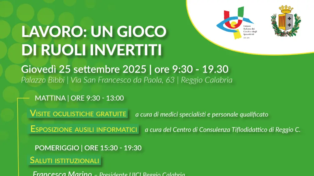 L’evento, intitolato “Lavoro: un gioco di ruoli invertiti”, si terrà giovedì 25 settembre 2025, dalle ore 9:30 alle ore 19:30, presso il Palazzo Bibbi, Via San Francesco da Paola 63 – Reggio Calabria.