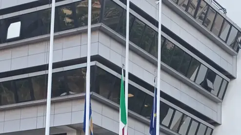 Bandiere esposte a mezz’asta sulla facciata di Palazzo Campanella in occasione delle esequie dei Carabinieri deceduti a Castel D'Azzano.