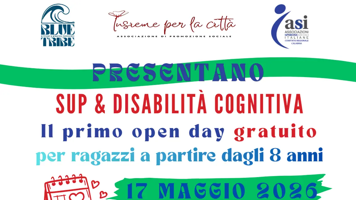 Il 17 maggio 2026, dalle ore 10 alle 12, il Centro Sportivo Andrea Maria di Pentimele diventa il luogo simbolo di un'iniziativa straordinaria: il primo Open Day gratuito del progetto "Sup & Disabilità Cognitiva – Il mare per tutti", promosso da Asi Calabria, in collaborazione con l'asd Blue Tribe e l'associazione Insieme per la Città Aps, con il supporto scientifico di Daniela Gullace, Analista del Comportamento.