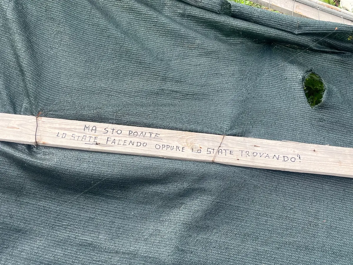 Uno stato di abbandono del cantiere e l’amara ironia di chi si chiede, scrivendolo sul legno della recinzione che ormai ha ceduto, se il ponte sul Calopinace di Reggio Calabria si stia costruendo oppure si stia cercando chissà dove.