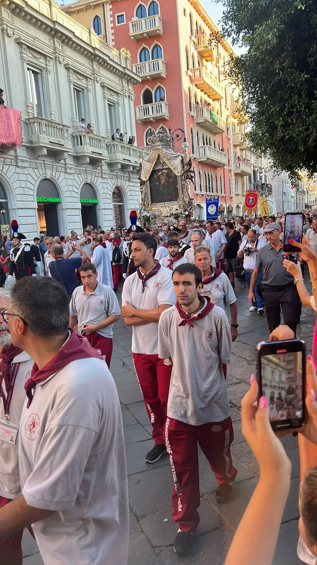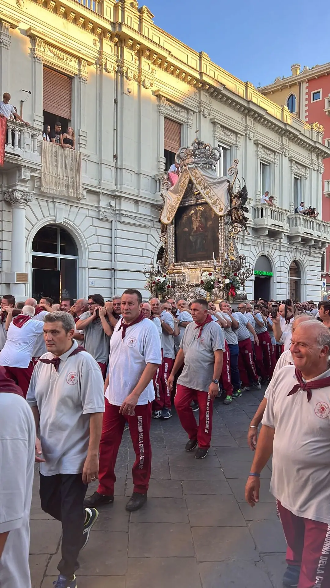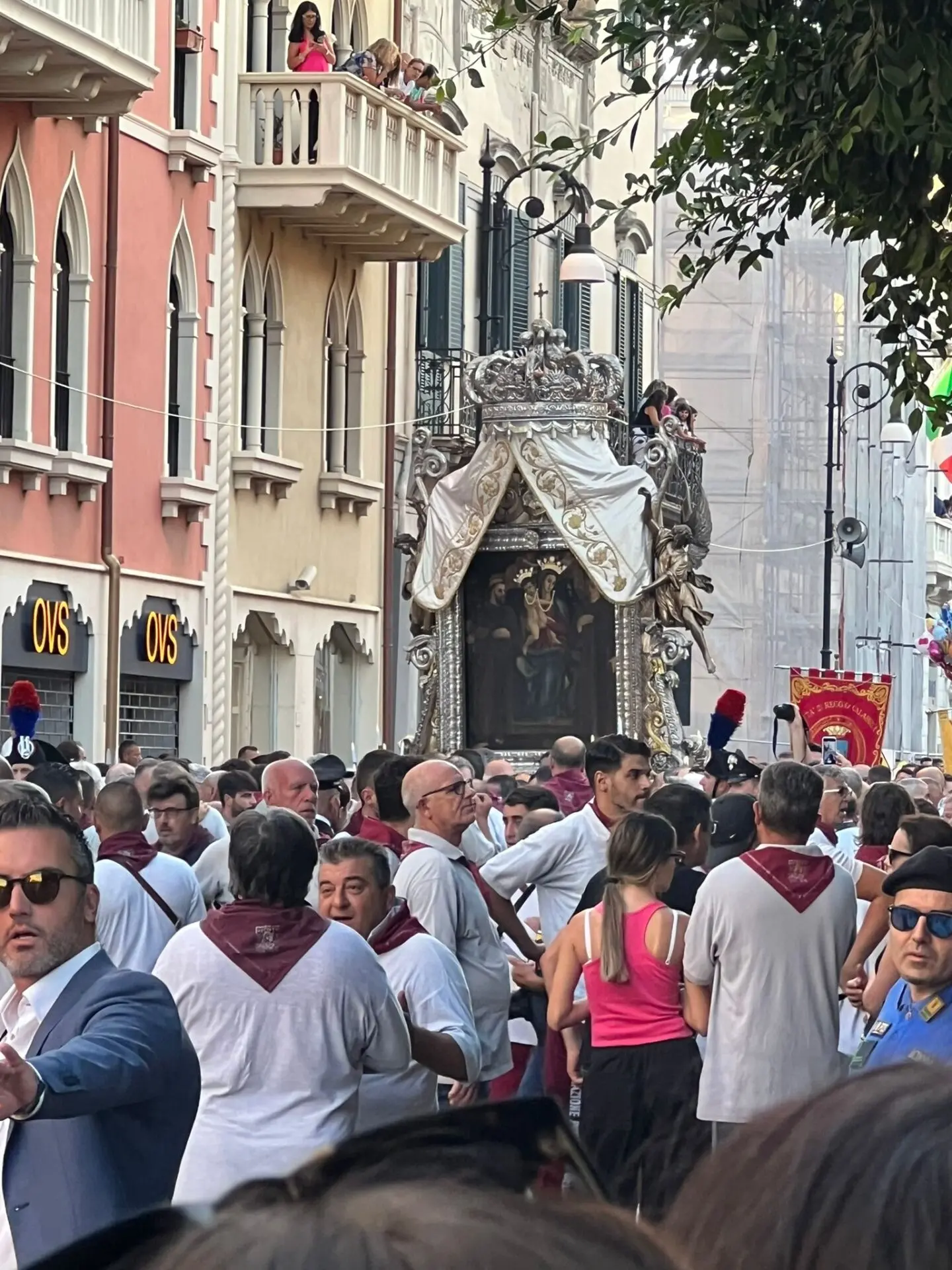 Essa percorre il tratto di Corso Garibaldi fino a piazza Italia. Quindi il giro con la sosta dinnanzi ai palazzi istituzionali, Prefettura, palazzo San Giorgio (Comune) e palazzo Alvaro (Città Metropolitana), questi ultimi due già vestiti a festa con i drappi ai balconi. Poi alla volta di piazza Garibaldi.