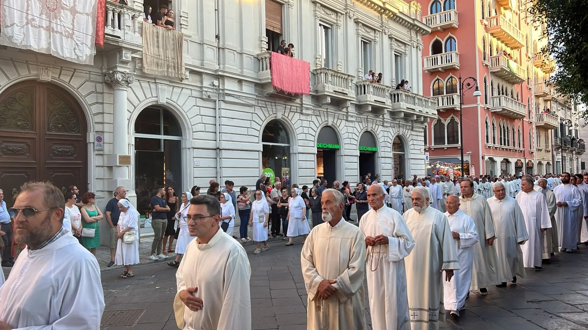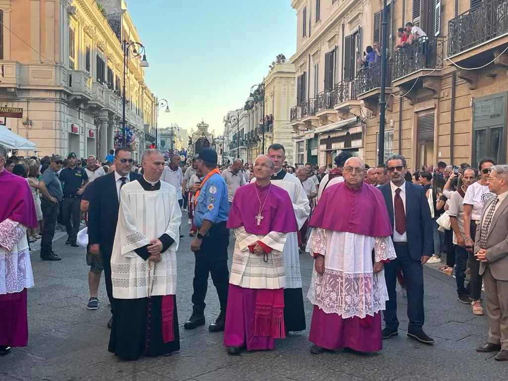 È il complesso bandistico di Ortì a guidare il corteo aperto dall’arcivescovo di Reggio – Bova, monsignor Fortunato Morrone e dai rappresentanti della chiesa Reggina. In mezzo ai cori che si sentono e alle preghiere silenti, sulle spalle dei Portatori la Vara ha momentaneamente lasciato il Duomo per abbracciare la comunità.