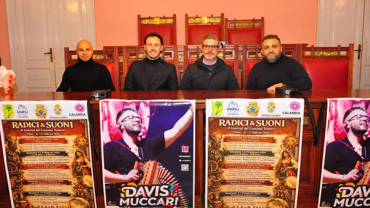 Si è svolta ieri, giovedì 12 febbraio 2026, presso la Sala Consiliare del Comune di Palmi, la Cerimonia ufficiale di apertura di “Suoni e Radici – Il Festival del Costume Sonoro”, il nuovo progetto culturale dedicato alla valorizzazione del costume identitario come espressione viva di suono, memoria e tradizione popolare.
