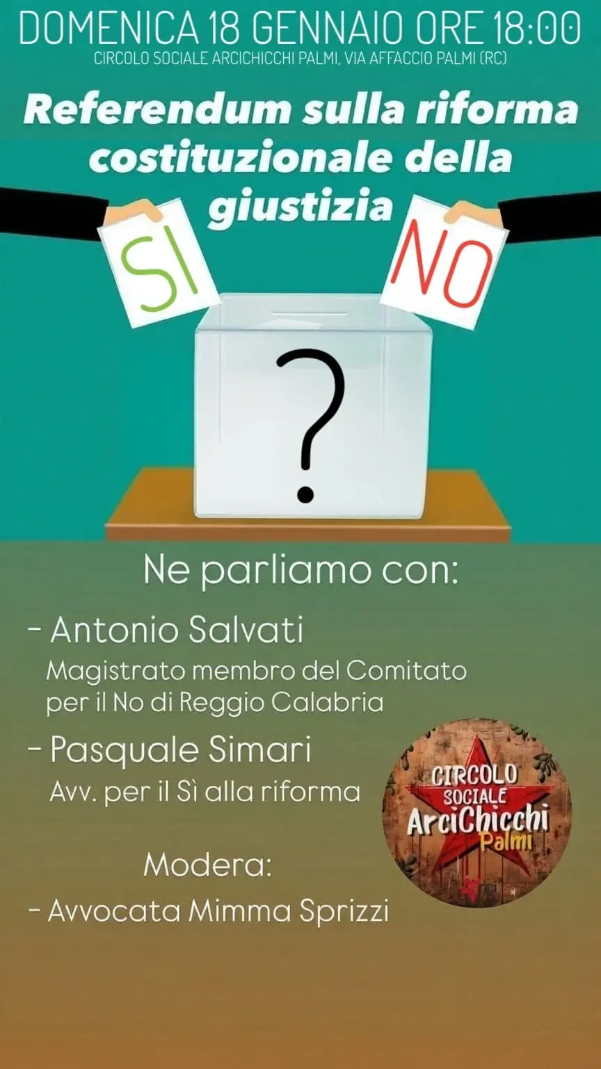 È importante parlarne. Perché la riforma costituzionale della giustizia non è una materia riservata agli addetti ai lavori, ma una questione che riguarda il funzionamento delle istituzioni e il rapporto tra cittadini e giurisdizione. Con questo spirito, domenica 18 gennaio 2026, alle ore 18:00, il Circolo Sociale Arci Chicchi di Palmi, in via Affaccio, ospiterà un incontro pubblico dedicato al tema, in vista del referendum costituzionale previsto per il prossimo mese di marzo.