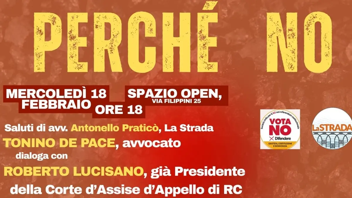Si terrà mercoledì 18 febbraio alle ore 18, presso Spazio Open (via Filippini 25) a Reggio Calabria, l’incontro pubblico dal titolo “Perché No”, un momento di confronto e approfondimento sui temi legati al prossimo referendum e alle conseguenze di una riforma alla quale La Strada dice convintamente “No”.