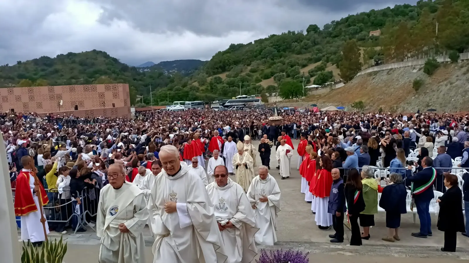 Alla testimonianza di Fratel Cosimo ha fatto seguito la processione d’ingresso della statua di Nostra Signora dello Scoglio, prima delle celebrazioni presiedute dal vescovo Oliva, alla presenza di altri sacerdoti.