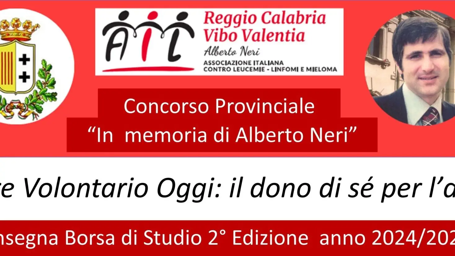 Il 29 Maggio p.v. alle ore 10 presso il Palazzo “Corrado Alvaro” di Reggio Calabria – Sala Perri- avrà luogo, alla presenza delle massime autorità scolastiche e cittadine, la cerimonia di consegna della Borsa di Studio della II Edizione del Concorso Provinciale “In memoria di Alberto Neri” – Essere volontario oggi: il dono di sé per l’altro- a.s. 2024/2025 indetta dalla sez. AIL – Associazione Italiana contro le Leucemie, Linfomi e Mieloma, di Reggio Calabria.