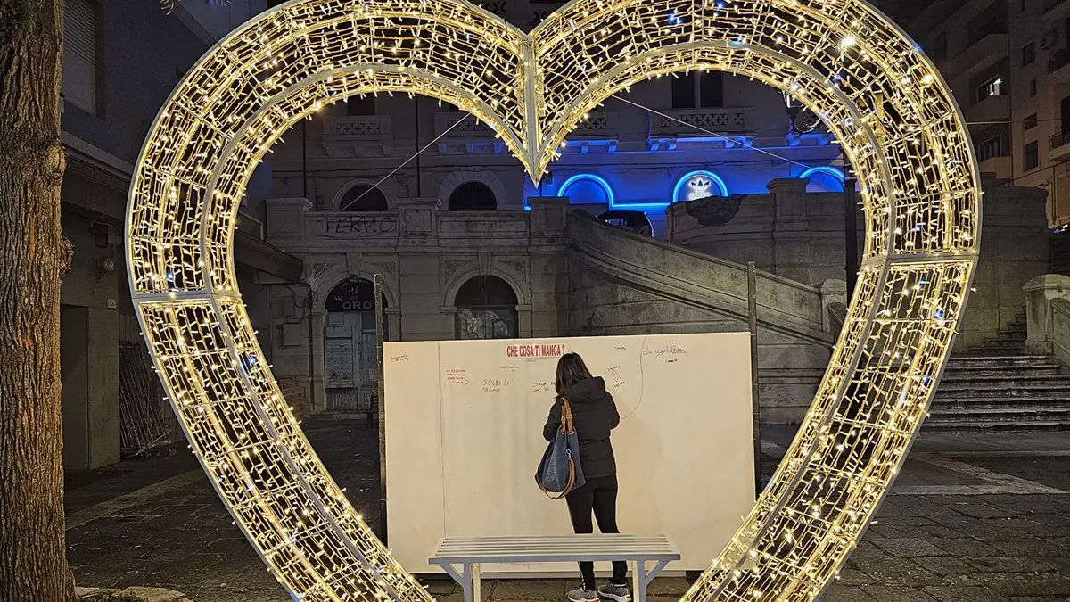 Dietro il cuore led in 3d alto tre metri su un grande telo si cela la scritta ‘Cosa ti manca?’ con attorno centinaia di frasi e pensieri dei giovani reggini.