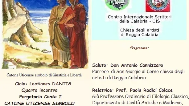 Nell’ambito del ciclo di incontri: Lectiones Dantis 2025, il Centro Internazionale Scrittori della Calabria e la chiesa degli artisti di Reggio Calabria, nel salone della stessa chiesa, giovedì 19 giugno 2025, alle ore 18:00, promuovono la quinta lezione “Purgatorio Canto I. Catone Uticense simbolo di Giustizia e Libertà”.