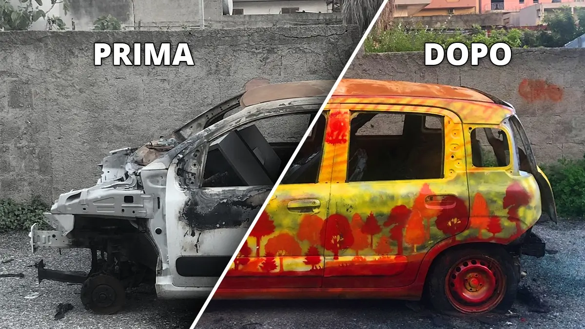 A poco, purtroppo, è servito l’avviso, perché la carcassa della vettura si trova ancora al suo posto, ma per rendere più accogliente l’accesso alla struttura, prima gli ospiti del centro diurno Armonia hanno provveduto a ripulire la strada da erbacce e rifiuti e, successivamente, visto il ritardo nell’intervento di rimozione dell’auto data alle fiamme i ragazzi del centro “Noi Ragazzi di Oggi“, in particolar modo quelli frequentanti il corso artistico creativo, hanno pensato di mascherare una “bruttura” e donarle una nuova vita con un po’ di “make-up“.
