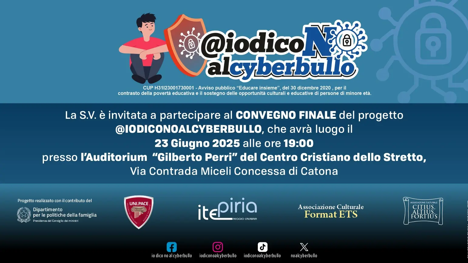L’evento conclusivo del progetto “Io Dico No al Cyberbullismo”, si terrà domani lunedì 23 giugno alle ore 19.00 presso l’Auditorium “Gilberto Perri” del Centro Cristiano dello Stretto, sito in Via Contrada Miceli Concessa di Catona (RC).