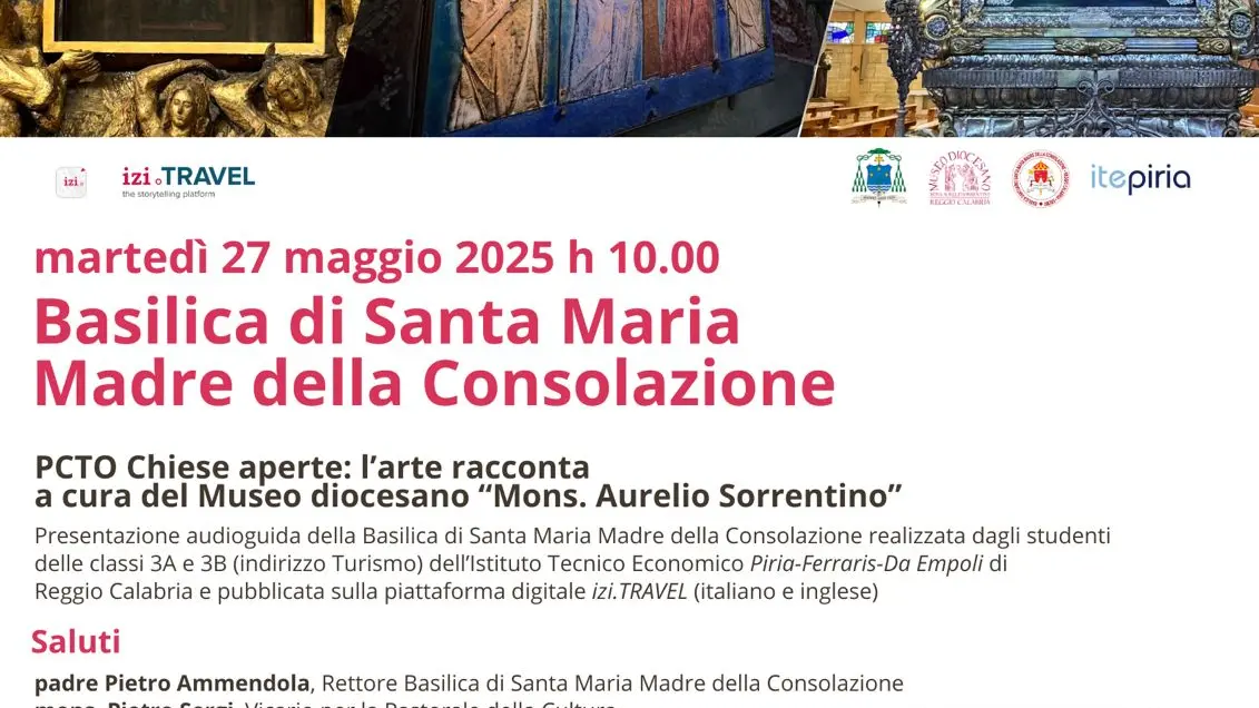 Martedì 27 maggio h 10 nella Basilica Santuario di Santa Maria Madre della Consolazione di Reggio Calabria gli studenti delle classi IIIA e IIIB (indirizzo Turismo) dell’Istituto Tecnico Economico Piria-Ferraris-Da Empoli presenteranno le audioguide realizzate nell’ambito del PCTO Chiese aperte: l’arte racconta, condiviso con il Museo diocesano di Reggio Calabria.