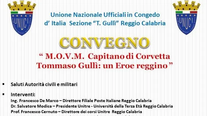 La Sezione provinciale “Tommaso Gullì” dell’ U.N.U.C.I. – Unione Nazionale Ufficiali in Congedo d’Italia di Reggio Calabria, presieduta da Nicola Pavone, ha organizzato in videoconferenza il Convegno “M.O.V.M. Capitano di Corvetta Tommaso Gullì: un Eroe reggino” che avrà inizio alle ore 17:30 del giorno 12 luglio 2021 nel 101° anniversario della sua morte avvenuta a Spalato. Per la particolare ricorrenza il Gruppo filatelico – numismatico dell’U.N.U.C.I. ha organizzato uno speciale annullo filatelico di Poste italiane e le relative cartoline filateliche.