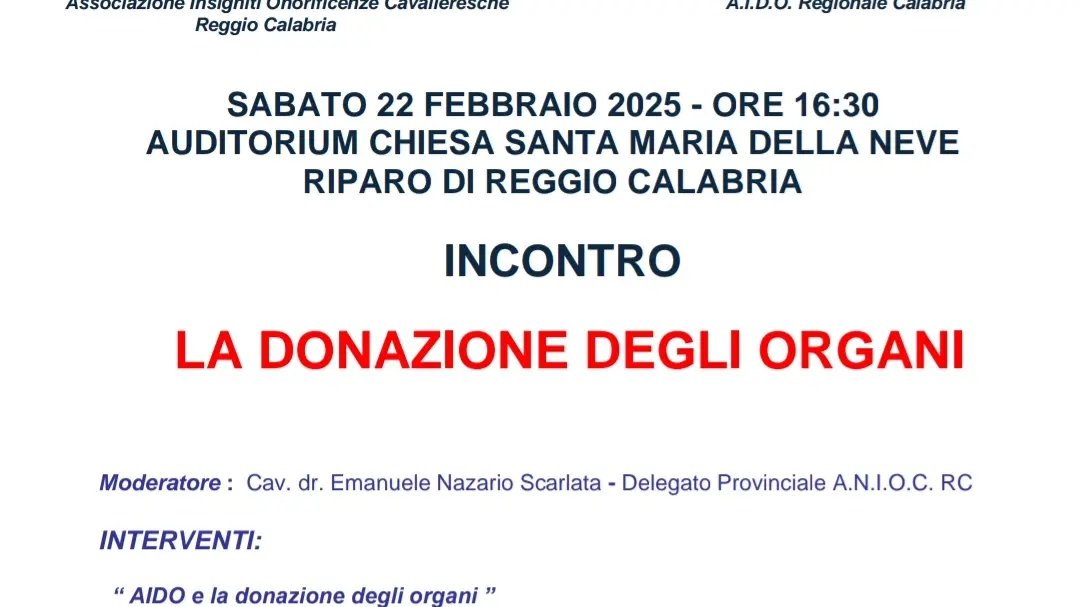 L’importante evento, organizzato dall’associazione Insigniti Onorificenze Cavalleresche Reggio Calabria e l’Aido (Associazione italiana per la donazione di organi, tessuti e cellule) con il patrocinio del Sacro Militare Ordine Costantiniano di San Giorgio Delegazione Calabria, vedrà gli interventi del presidente Aido Nicola Pavone che relazionerà su “Aido e la donazione degli organi”, il Cappellano don Giovanni Gattuso che affronterà il “Valore della vita come dono sacro: una visione spirituale della donazione degli organi” e le testimonianze della dottoressa Giovanna Campolo (vicepresidente vicaria Aido Gruppo comunale RC) e del medico legale Renato Saraceno.