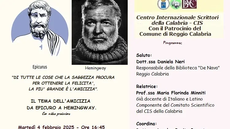 Martedì 4 febbraio 2025, alle ore 16:45 presso la Biblioteca Villetta “P. De Nava”, il Centro Internazionale Scrittori della Calabria, con il patrocinio del Comune di Reggio Calabria, promuove la conversazione “Di tutte le cose che la saggezza procura per ottenere la felicità, la più grande è l’amicizia. “Il tema dell’amicizia da Epicuro a Hemingway”.
