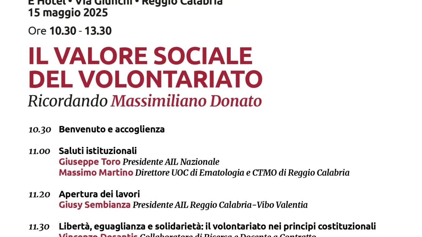 Il 15 maggio dalle ore 10.30 presso l’È Hotel di Reggio Calabria si svolgerà l’incontro organizzato da AIL sezione “Alberto Neri” di Reggio Calabria e Vibo Valentia in collaborazione con AIL Nazionale e Gruppo Malattie Mieloproliferative Croniche Ph- dal titolo Il valore sociale del volontariato – Ricordando Massimiliano Donato