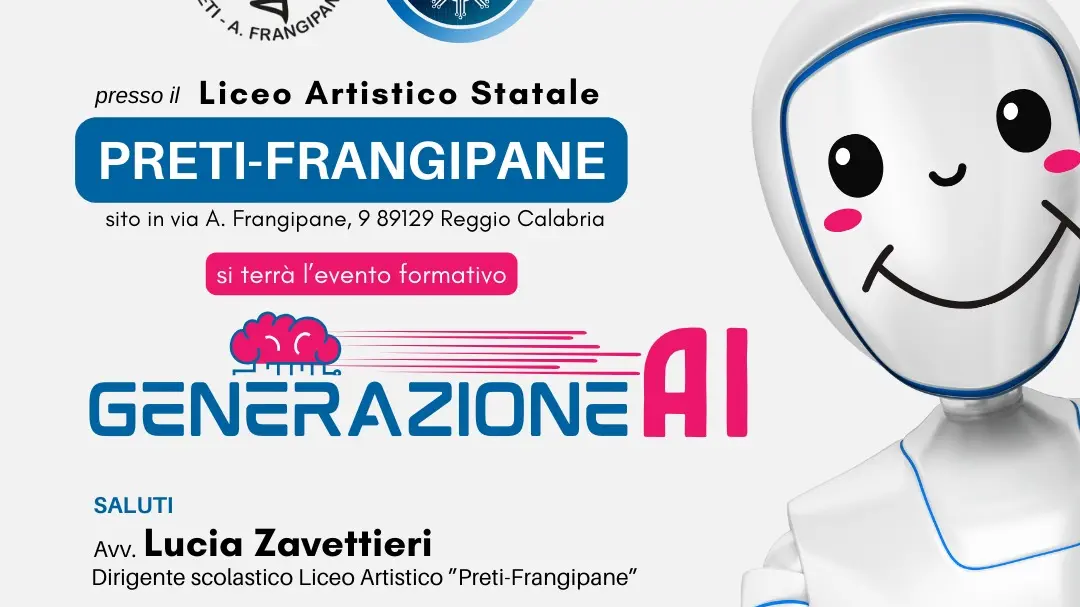 Dopo i saluti dell’Avv. Lucia Zavettieri, dirigente scolastico del Liceo Artistico Statale Preti-Frangipane, interverranno l’Ing. Alessandro Gatto, Specialist Ai che affronterà i temi relativi all’intelligenza artificiale generativa fornendo degli esempi pratici; l’ing. Beniamino Azzarà, Ceo di Sied IT che darà uno sguardo al mondo delle professioni future dopo l’impatto dell’Ai e l’avv. Riccardo Tripepi, presidente dell’associazione TgWebAi, che si occuperà di deepfake e etica per un utilizzo consapevole dell’Ai.