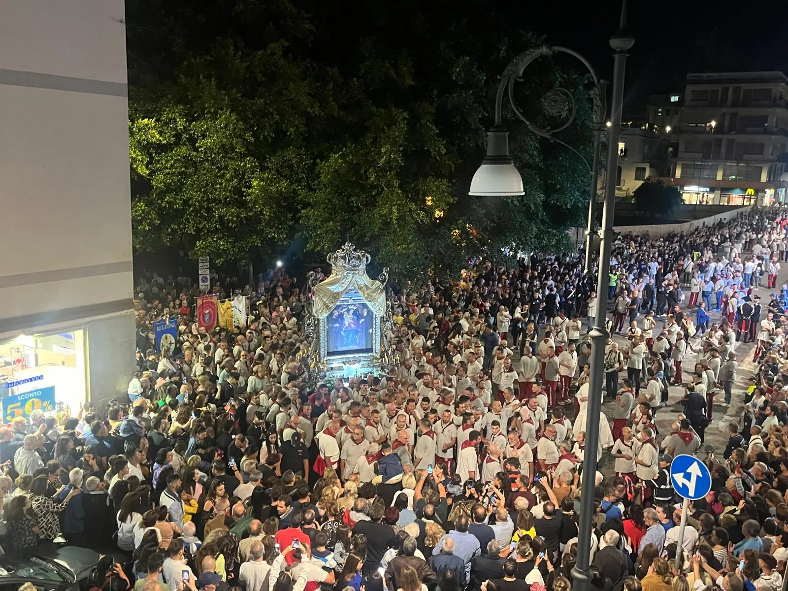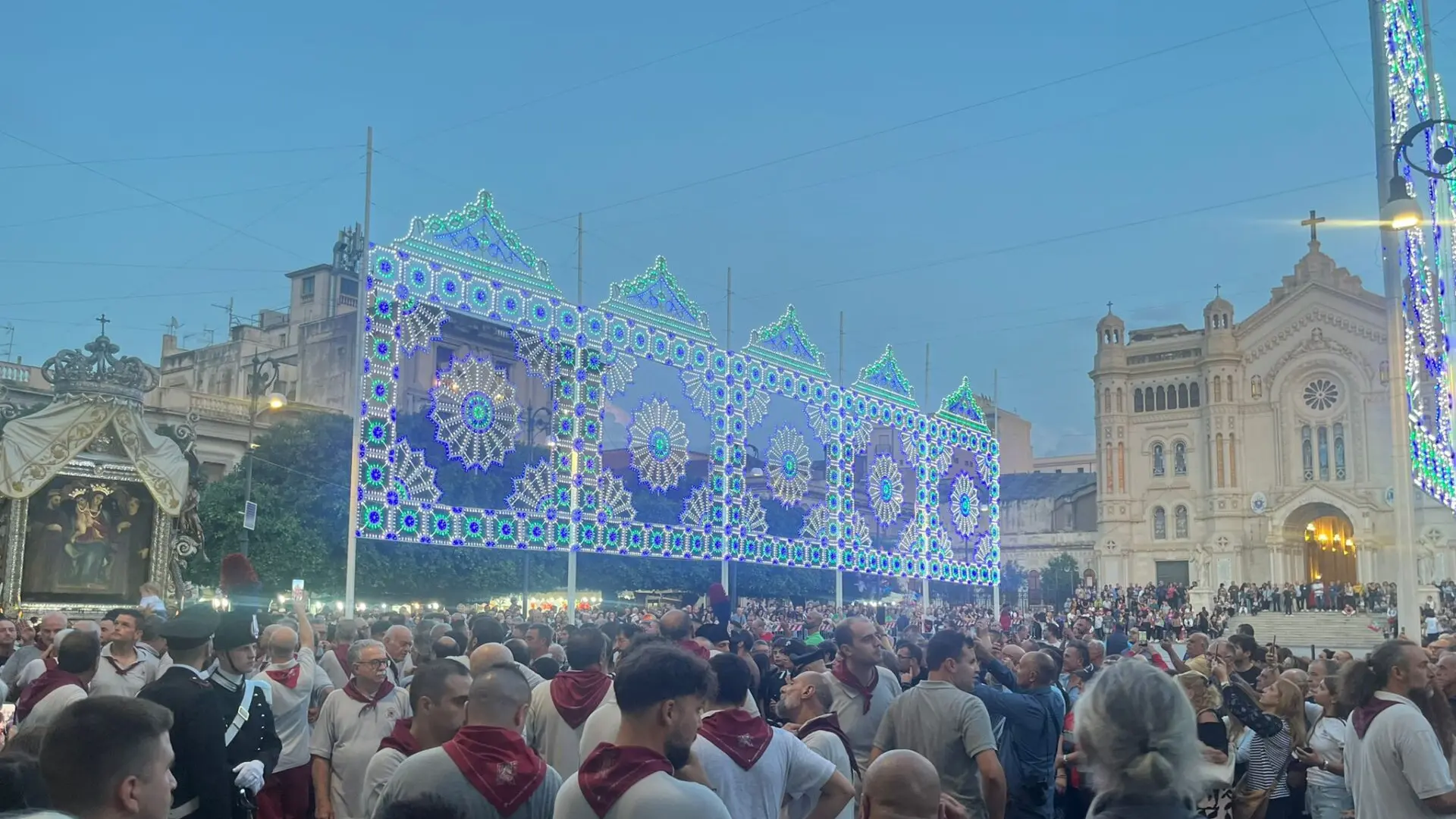 Cori, applausi, preghiere e sguardi intimi e assorti hanno scandito la sua puntualissima uscita dal Duomo sulle spalle dei portatori e il passaggio lungo il Corso Garibaldi. Fedeli sui marciapiedi, sui lati e affacciati dai balconi ornati con drappi esposti in suo onore.