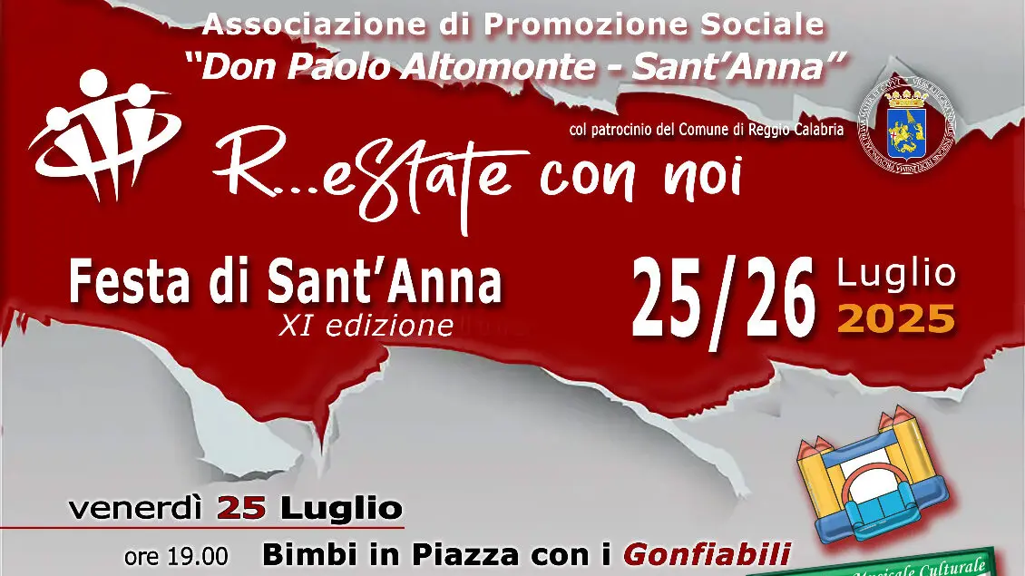 Ritorna l’appuntamento clou dell’Estate Reggina. Dopo le precedenti stupende edizioni della Festa, iniziata o meglio reinventata nel 2014 grazie all’immenso impegno dei ragazzi dell’Associazione di Promozione Sociale Don Paolo Altomonte (indimenticato Parroco di Sant’Anna), anche quest’estate ci ritroveremo in Piazza per quello che è divenuto oramai un appuntamento cult ed immancabile per tutta Reggio Calabria a cui desideriamo regalare due serate d’estate piene di gioia, divertimento e movimento.