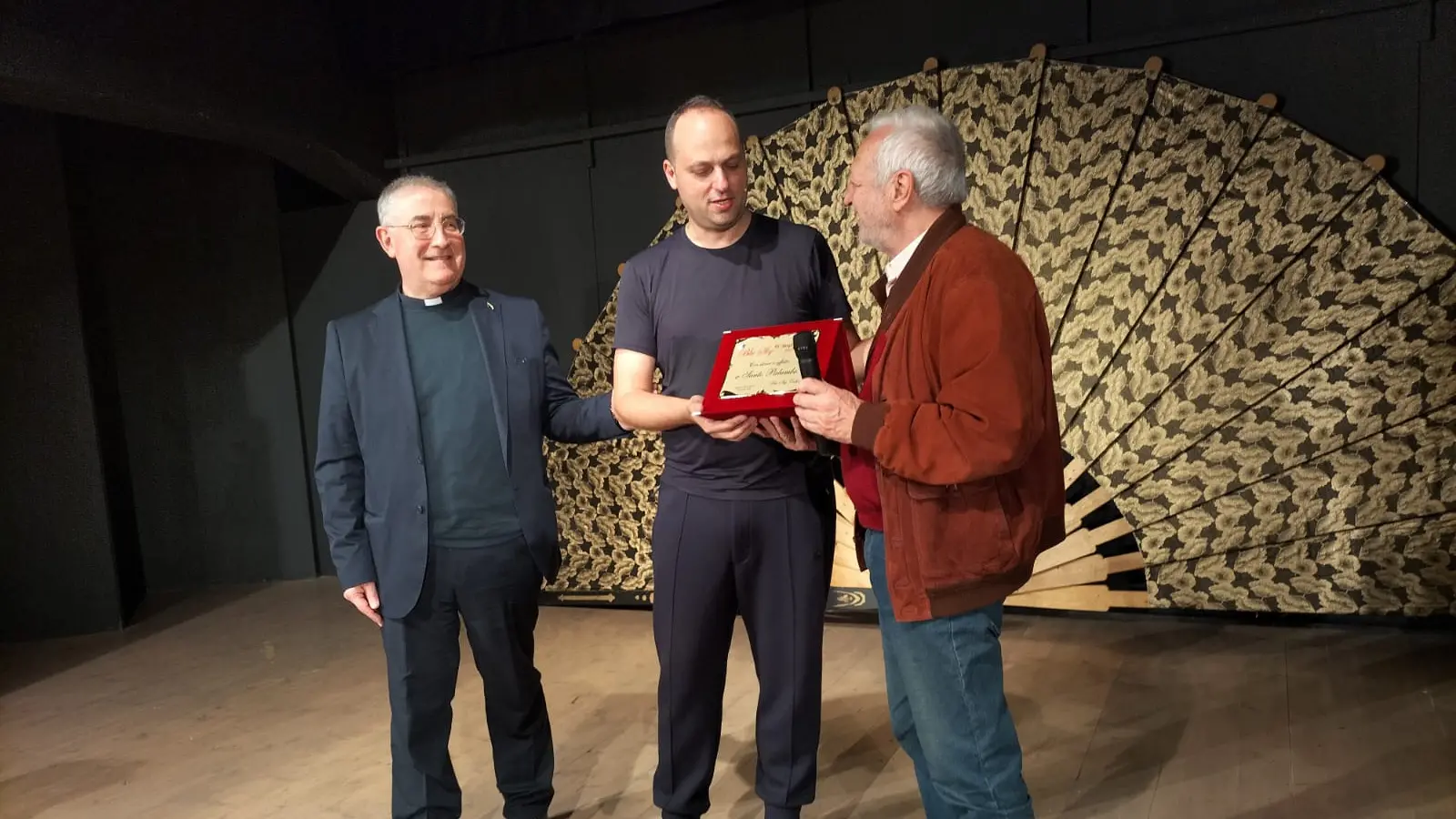 Alla fine dello spettacolo il padrone di casa Mons. Angelo Casile ed il presidente del Blu Sky cabaret Giuseppe De Gregorio hanno voluto tributare un ringraziamento all’artista Reggino consegnandogli anche un targa ricordo.