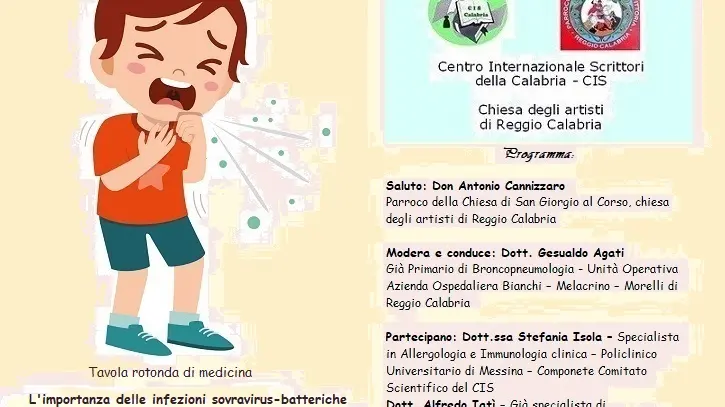 Il Centro Internazionale Scrittori della Calabria e la chiesa degli artisti di Reggio Calabria, mercoledì 14 maggio 2025, alle ore 17:30, nella Sala San Giorgio della stessa chiesa promuovono la tavola rotonda di medicina “L’importanza delle infezioni sovravirus-batteriche che vanno incontro solitamente ad un peggioramento” – Con video proiezione.