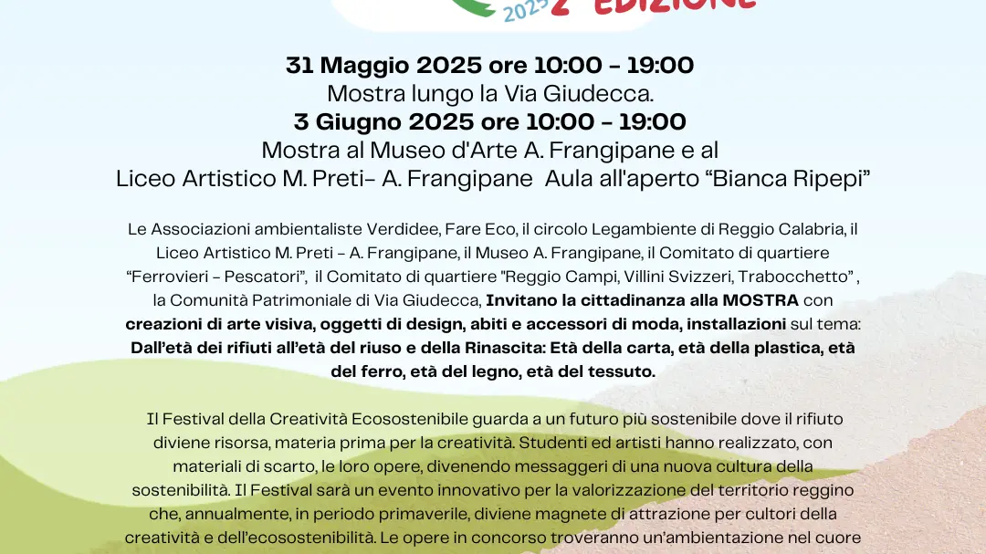 Le Associazioni ambientaliste Verdidee, Fare Eco, il circolo Legambiente di Reggio Calabria, il Liceo Artistico M. Preti – A. Frangipane, il Museo A. Frangipane, il Comitato di quartiere “Ferrovieri – Pescatori”, il Comitato di quartiere “Reggio Campi, Villini Svizzeri, Trabocchetto” e la Comunità Patrimoniale di Via Giudecca invitano la cittadinanza alla mostra con creazioni di arte visiva, oggetti di design, abiti e accessori di moda, installazioni sul tema: Dall’età dei rifiuti all’età del riuso e della Rinascita: Età della carta, età della plastica, età del ferro, età del legno, età del tessuto.